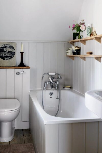 Там же, наверху, расположена и ванная комната — небольшая, но очень атмосферная.
