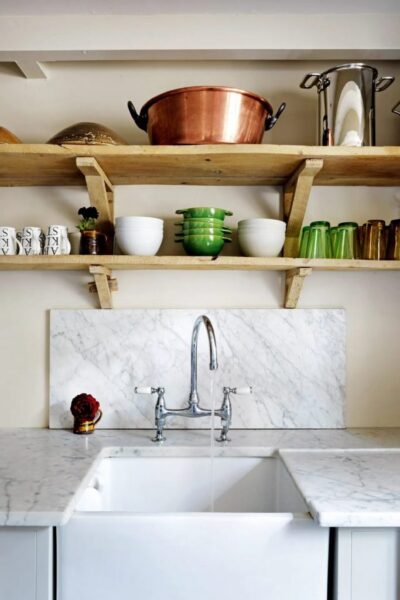 Интерьер оформлен так, чтобы сохранить ощущение старого дома: тёплые оттенки, простые формы, максимум уюта. Мраморная столешница и открытые полки добавляют скандинавских ноток в традиционный британский интерьер.