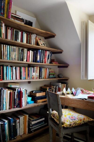 На верхнем этаже — спальни и небольшой кабинет с мини-библиотекой: место, где можно уединиться с чашкой чая и книгой.