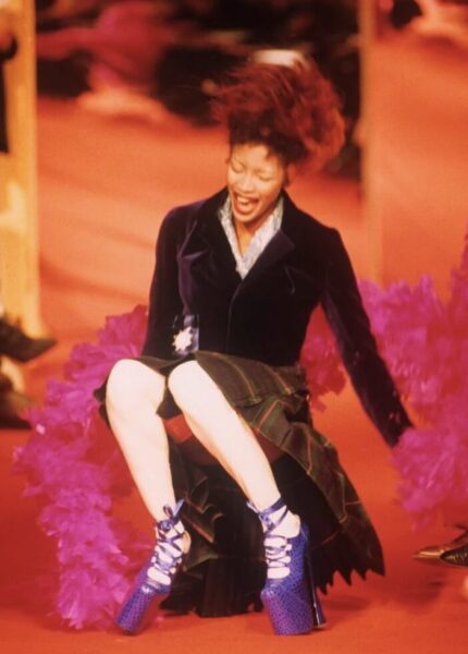 Самый известный эпизод — показ Vivienne Westwood в 1993 году, когда Наоми эффектно рухнула на подиум с 23-сантиметровых платформ. Вместо того чтобы злиться, она расхохоталась, превратив неловкий момент в один из самых запоминающихся кадров модной истории.